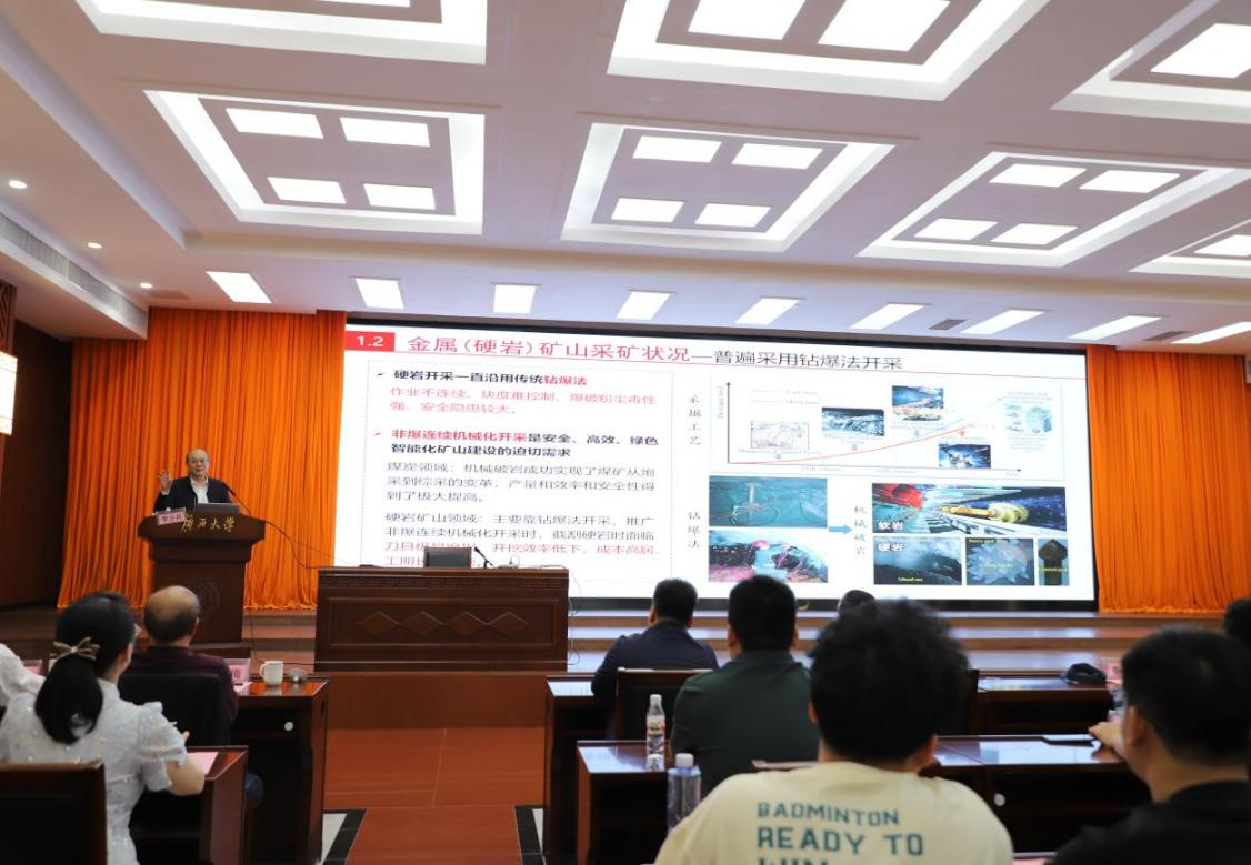 随后,李夕兵院士阐述了其团队在岩石动力学理论与深部开采技术领域的原创性成果:提出岩石动静组合加载破裂理论,揭示了深部岩体在静应力与开采扰动耦合作用下的破裂机理及灾害演化规律;研发深部地应力精准测量、采场地压微震监测预警等关键技术装备,构建了复杂环境下资源安全高效低贫损开采新模式;创新深部高应力诱导致裂非爆连续开采技术,该技术已在国内多个矿山实现工程应用,为破解硬岩连续开采难题提供了可推广的中国方案。