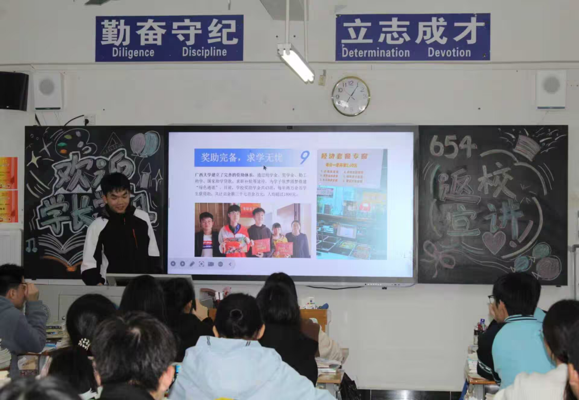 2月9日,材科253班张瑜与矿资251班韦诗音一同回到河南省淅川县第一高级中学。他们精心准备了宣讲内容,从西大的历史沿革到近年来的发展成就,从特色专业到国际交流,全方位展示广西大学的魅力,激发了在场学子报考西大的热情。