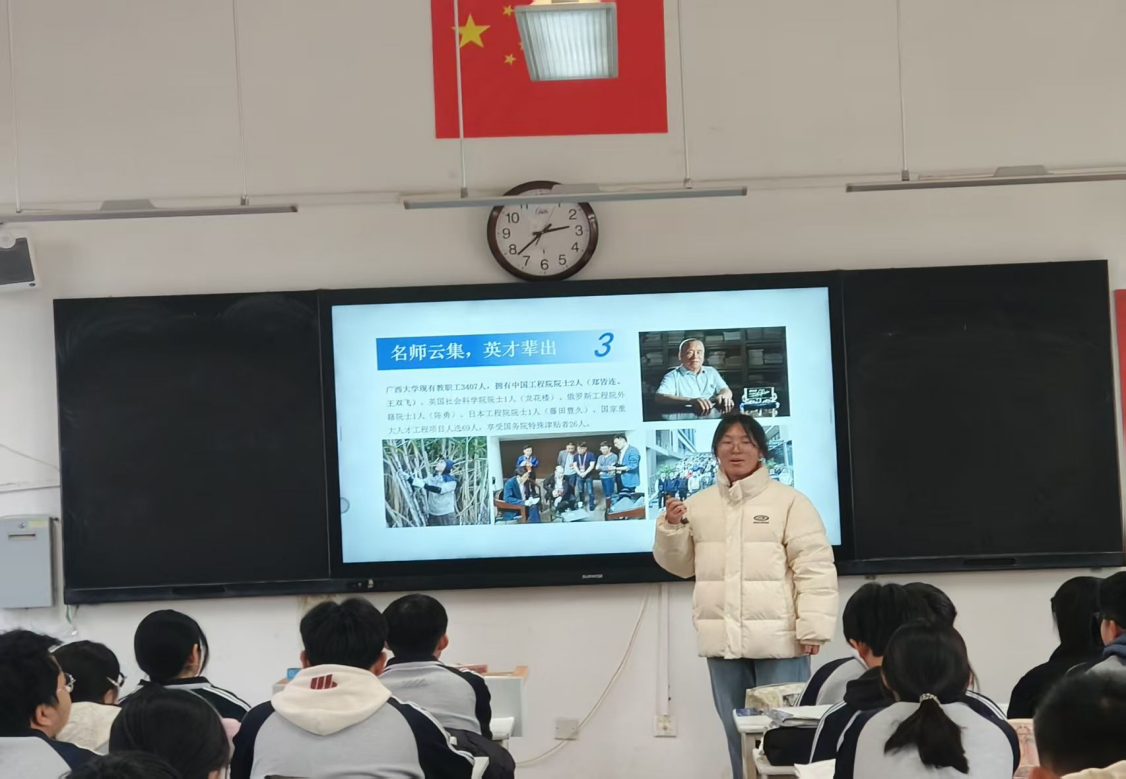 同一天,材科243班黄玥玲与环工252班谭倍倍携手走进大化高中,通过分享自己在西大的成长故事,为学弟学妹们勾勒出大学生活的精彩画卷。从课堂学习到社团活动,从科研实践到志愿服务,她们的讲述让在场学子对西大充满了憧憬。