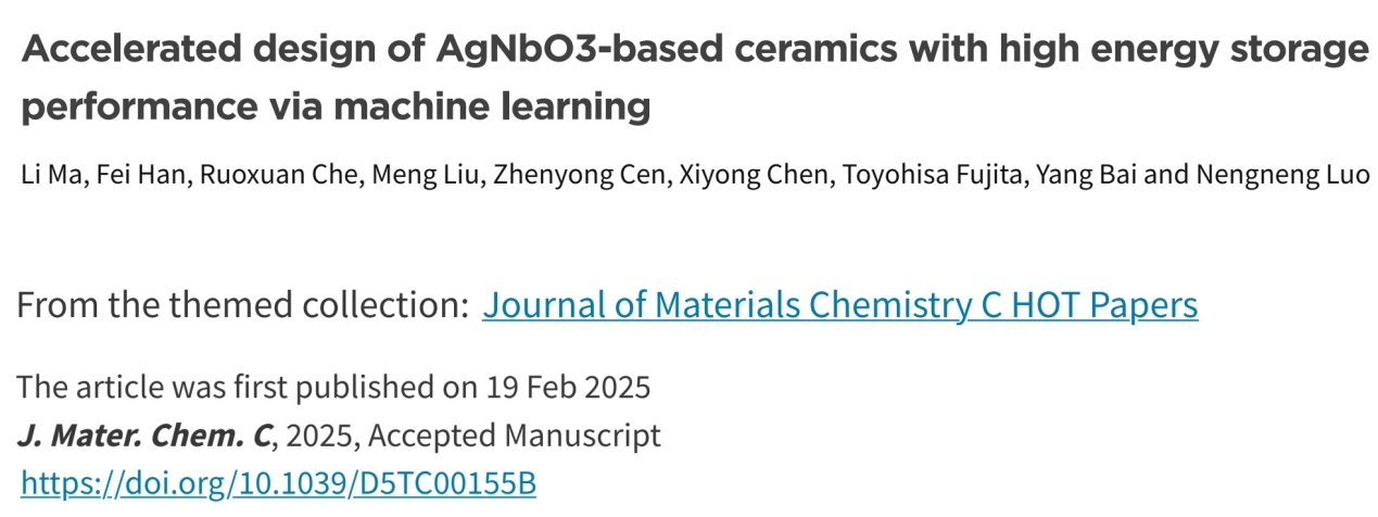 罗能能教授课题组在利用机器学习指导无铅反铁电储能陶瓷设计领域取得重要进展,相关研究成果以“Accelerated design of AgNbO3-based ceramics with high energy storage performance via machine learning”为题,发表在材料领域期刊Journal of Materials Chemistry C上,并被评选为热点文章。化学化工学院博士生马力和北京科技大学博士生韩飞为该论文的共同第一作者,小妲己