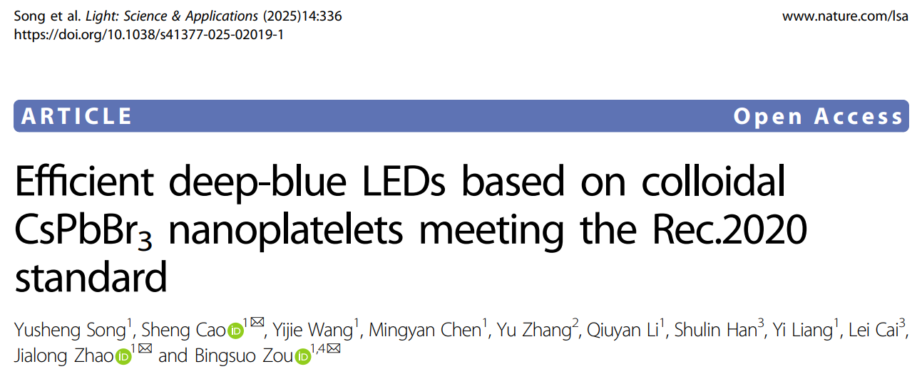 邹炳锁教授领衔的纳米光子学材料与技术团队在深蓝光发光器件研究领域取得新进展。相关成果以“Efficient deep-blue LEDs based on colloidal CsPbBr3 nanoplatelets meeting the Rec.2020 standard”为题,发表在国际顶尖Nature学术期刊子刊Light: Science & Applications上。邹炳锁教授与物理科学与工程技术学院曹盛、赵家龙为共同通讯作者,广西大学为论文的第一单位及通讯单位。