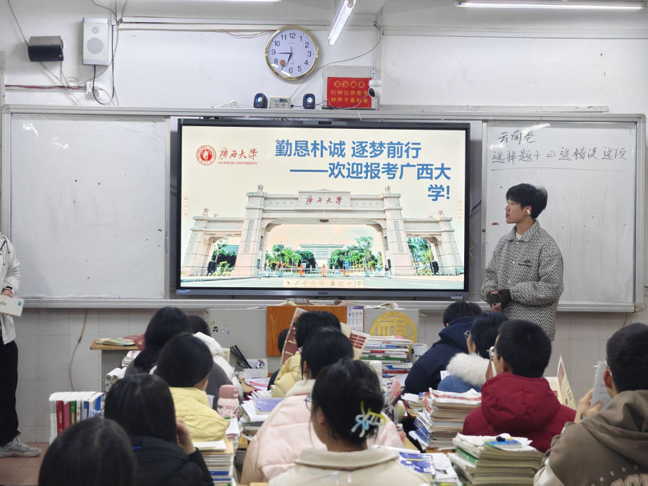 “我为西大打call!”——1月21日,矿物资源工程241班兰世民同学及其组员在广西资源县资源中学进行招生宣传。他们通过视频、图片和文字等形式介绍广西大学办学历史、校园环境、教学设施、师资力量和建设成绩,现场解答母校学弟学妹关于高考复习、志愿填报、西大校园生活等问题,以饱满的热情和专业的态度为学校代言。